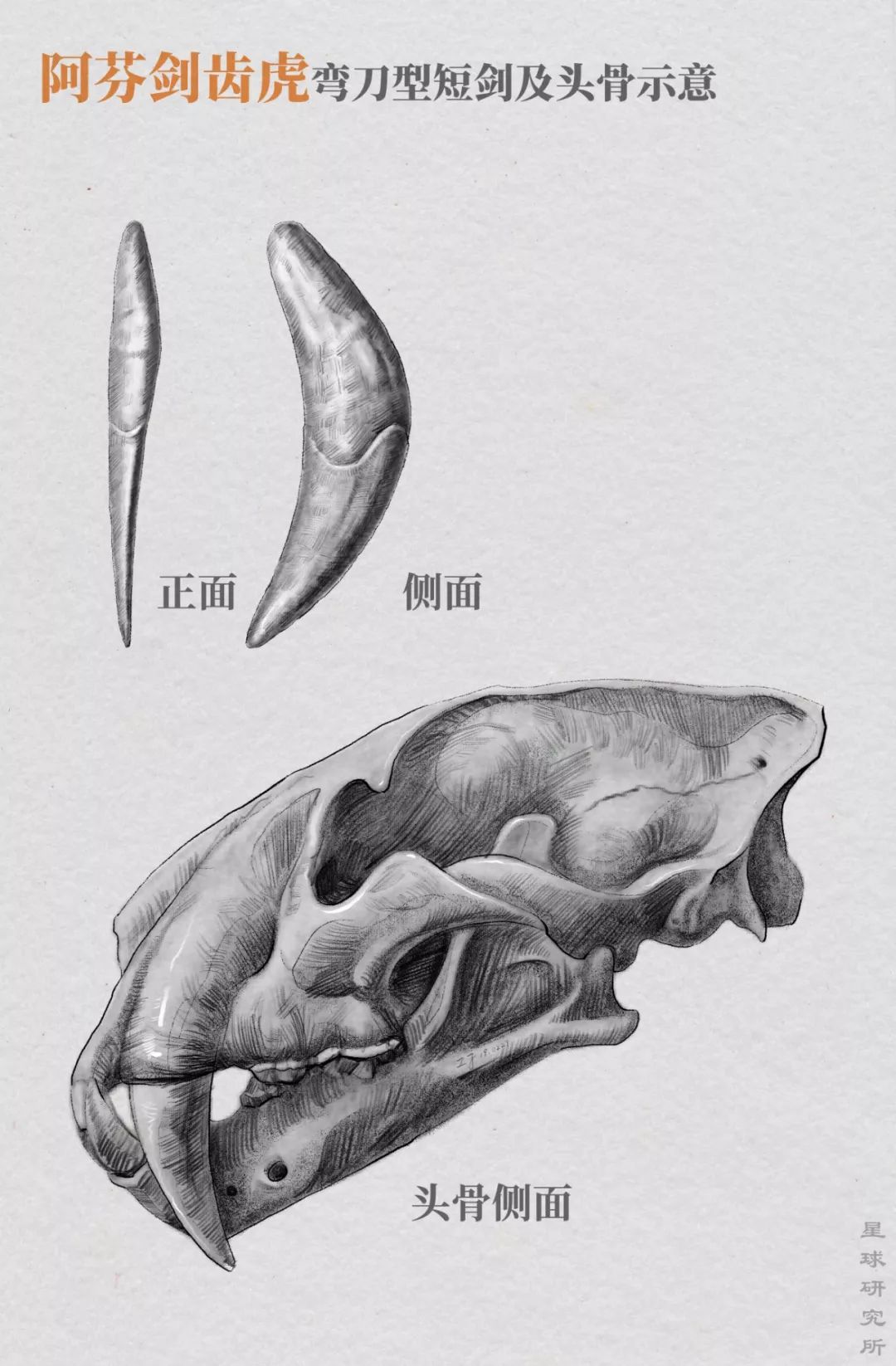 (阿芬剑齿虎弯刀型短剑及头骨示意,制图@张靖/星球研究所)