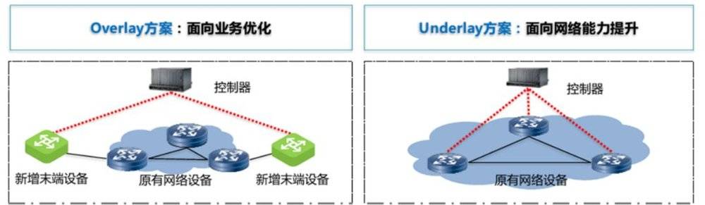 Overlay方案面向业务优化。中间网络穿通,控制器管理末端网络设备,无需改造大网,部署时间短;由业务驱动,能够灵活高效响应业务需求;但是没有第三方公司差异化竞争,不能体现核心价值。