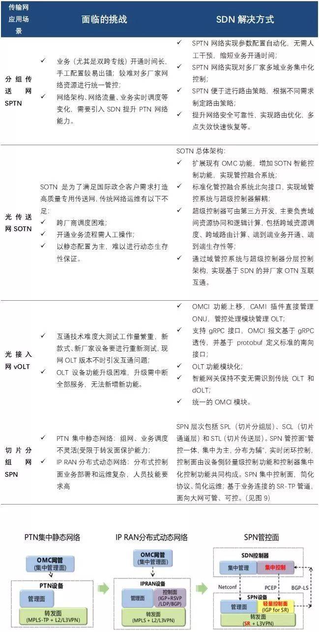 2. 传输网方面的应用场景,包含分组传送网SPTN、光传送网SOTN、光接入网Volt和切片分组网SPN。