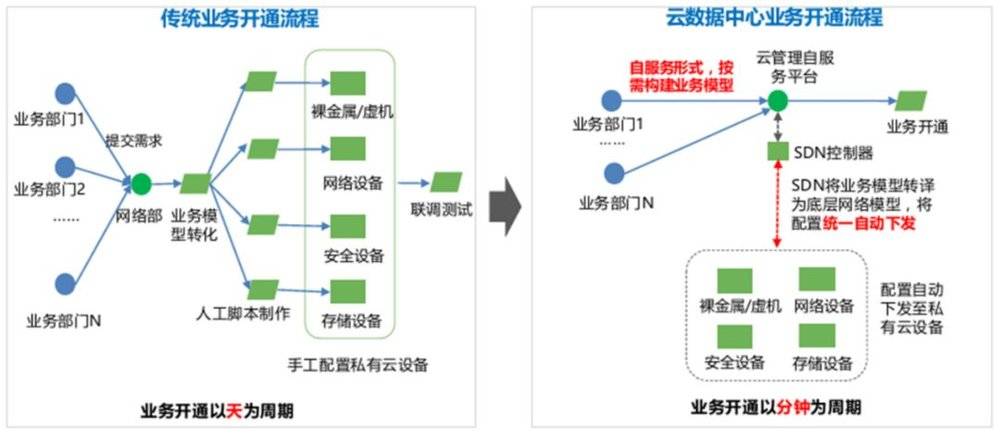 相比传统数据中心,SDN数据中心具备开通周期短、配置规范性强和易于运维操作三大优势。
