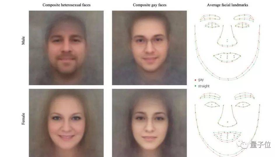 然后作者根据面部特征训练了一个回归模型来预测性取向。2017年斯坦福大学的研究就是这么做的。当时,Kosinski教授把人脸所有相同性取向的脸合成了4张图片: