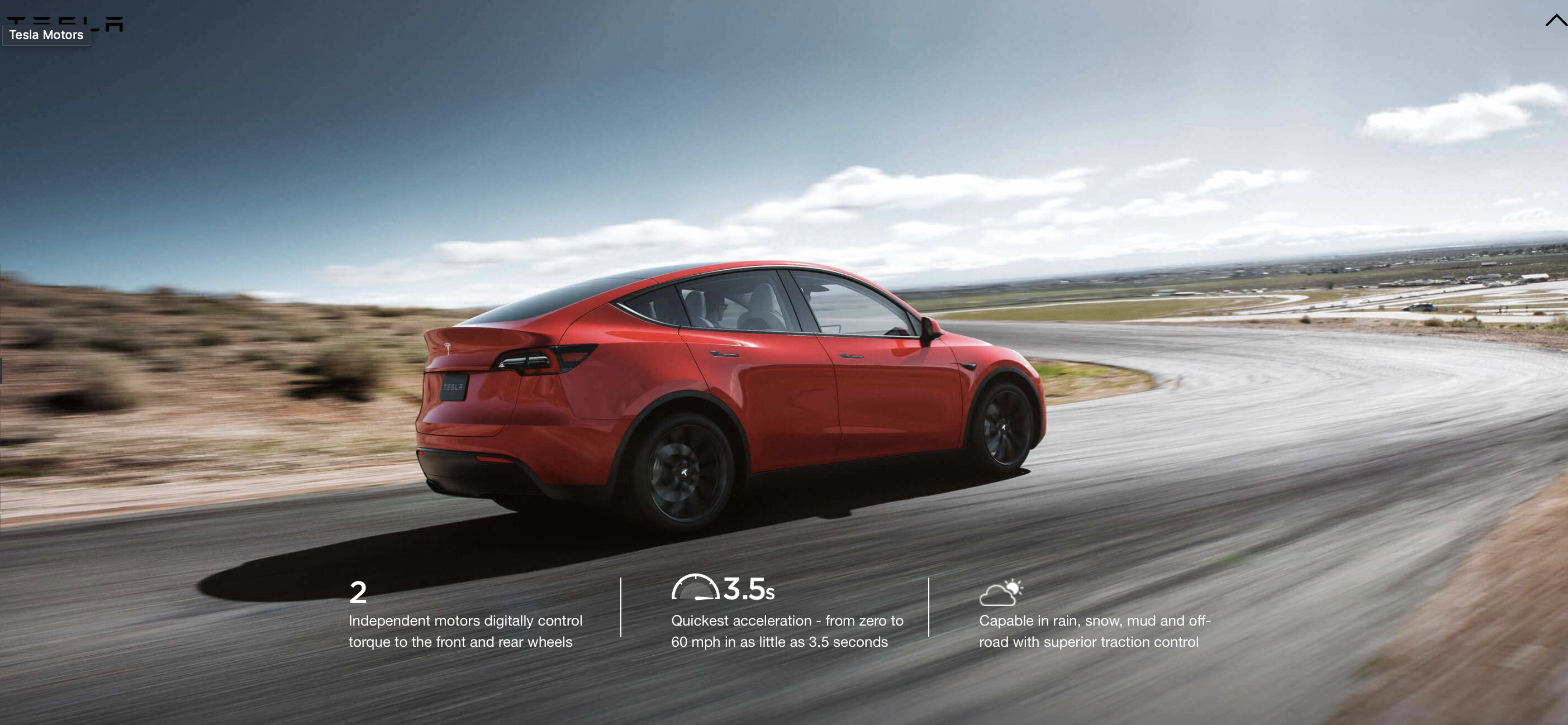 虽然是 SUV 身份,Model Y 并非全系皆为全轮驱动,只有双电机、性能版为双电机全驱,而标准续航、长续航版为单电机后驱。特斯拉按照惯例并未公布功率和扭矩,不过搭载的很可能就是 Model 3 所用电机。各版本的 0-96km/h 加速成绩分别为 5.9(标准续航)、5.5(长续航)、4.8(双电机全驱)、3.5(性能版)秒,如前文所说,相比 Model 3 有微小幅度下降。