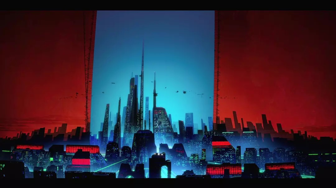 威尼斯的上空密集地停泊着一艘艘星际飞船。飞船的船舷装满了巨大的全反射发光面板,把飞船的颜色跟天空的真实颜色统一起来。