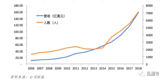 Netflix作为一家千亿美金市值的公司,2018年营收158亿美元,员工人数只有7100人,而估值相当的迪士尼,2018年营收594亿美元,员工人数,20万。