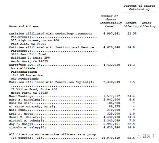 伦道夫为什么就能忍受被“边缘化”?的确,看着自己带出来的团队被逐渐瓦解,自己的掌控地位也摇摇欲坠,换做任何人也难以接受。但是,由于公司逐渐扩张,业务层面在产品上无情的优化和冷酷的增长并非伦道夫的强项,资本层面在华尔街的认知中,哈斯廷斯的影响力更是他望尘莫及的。因此这也是无奈之举,伦道夫只能对此表现出尽可能的“豁达”。另外,更重要的在于,哈斯廷斯是公司绝对控股股东,而伦道夫在公司只有少数的股份。