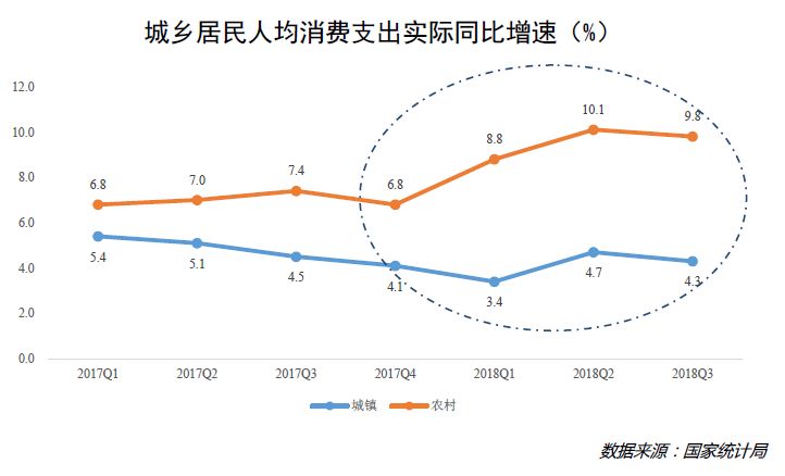 以城乡居民为例,根据国家统计局有关数据,剔除价格因素后,近两年的农村居民人均可支配收入增速均高于城镇居民,而且城乡居民消费增速的“剪刀差”已经呈现出来。值得一提的是,较低的房价让下沉市场居民很少会为巨额房贷而担忧,因而他们往往拥有更为旺盛的消费意愿,甚至不亚于一二线城市居民。