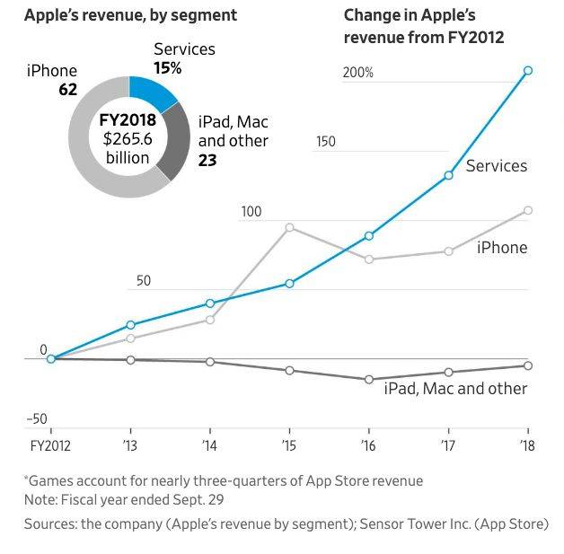 实际上,服务业务营收的天花板并没有想象中的高。华尔街分析师算了一笔账,到 2020 年,假设以每月 15 美元的价格增加 2000 万订阅用户,也只能给苹果的利润带来 1% 的提高。而每月 10 美元的 Apple News 新闻服务只能给苹果的利润带来 0.4% 的帮助。尽管苹果服务业务的比重正在逐年攀升,2018 财年,苹果服务业务的占比已经达到了 15%,但和 iPhone 高达 62% 的营收仍有差距,只能说苹果的营收结构比以前更加合理。