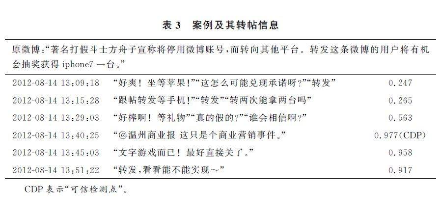 从该表我们观察到,由于这些时间间隔中的信息互相冲突,前几个间隔的预测概率变化很大。从“可信检测点”(CDP)起,CED开始进行正确预测而且概率非常一致。这符合CED的假设,即“可信预测点”之后的预测曲线应该是稳定的。同时,我们可以说,“可信检测点”处对应的转帖人,就是该微博评论中的意见领袖,强力地影响了后续评论人的意见,并使他们的意见趋向稳定。同时,也带来了预测概率的骤增,使得早期谣言检测效果有所提升。所以,正确引导意见领袖,发挥其积极作用,对于社交媒体中的谣言早期检测是非常重要的。