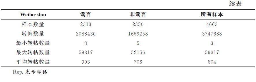Yang等(2012)面向中文新浪微博进行谣言的分析与检测,文中指出当时新浪微博的用户量是Twitter用户量的8倍之多,并且有许多与Twitter不同的功能,其中之一就是新浪微博拥有官方的谣言举报与公布平台。在方法方面,该文引入了基于客户端和用户位置的特征,能够更加准确地识别新浪微博的谣言,在真实数据集上的定量实验也验证了这些特征的有效性。