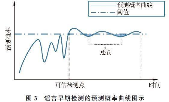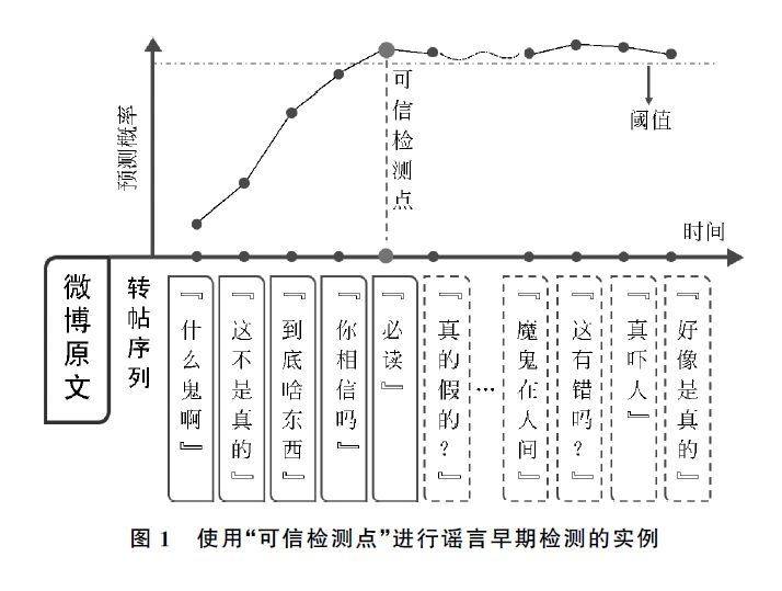 如图1所示,我们针对疑似谣言的转帖序列提出了随时间变化的预测概率曲线。对于这个例子,我们可以在早期的时间戳上做出可信的预测。对于谣言信息,转帖中往往会提出很多怀疑和反驳。基于该观察,我们引入“可信检测点”(credible detection point)概念,并利用深度神经网络技术设计了谣言早期检测模型:可信早期检测(credibl eearly detection, CED)。