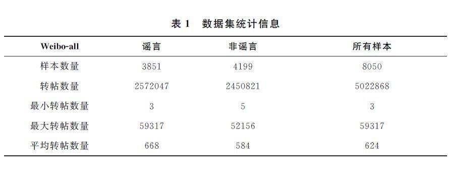 我们使用Yu等(2017)的研究中来自新浪微博的谣言数据集评估模型的有效性,标记为“Weibo-stan”。我们获取数据集中的微博ID列表,并收集每条微博的所有转发信息。此外,为了在更多的情况下验证模型的性能,我们还抓取了更多的微博数据来构建更大的数据集,称为“Weibo-all”。为了获取更多的微博数据,我们从报告各种谣言信息的新浪社区管理中心获得了一组已知的谣言。我们还收集了相当数量的非谣言微博。表1列出了这两个数据集的详细统计数据。