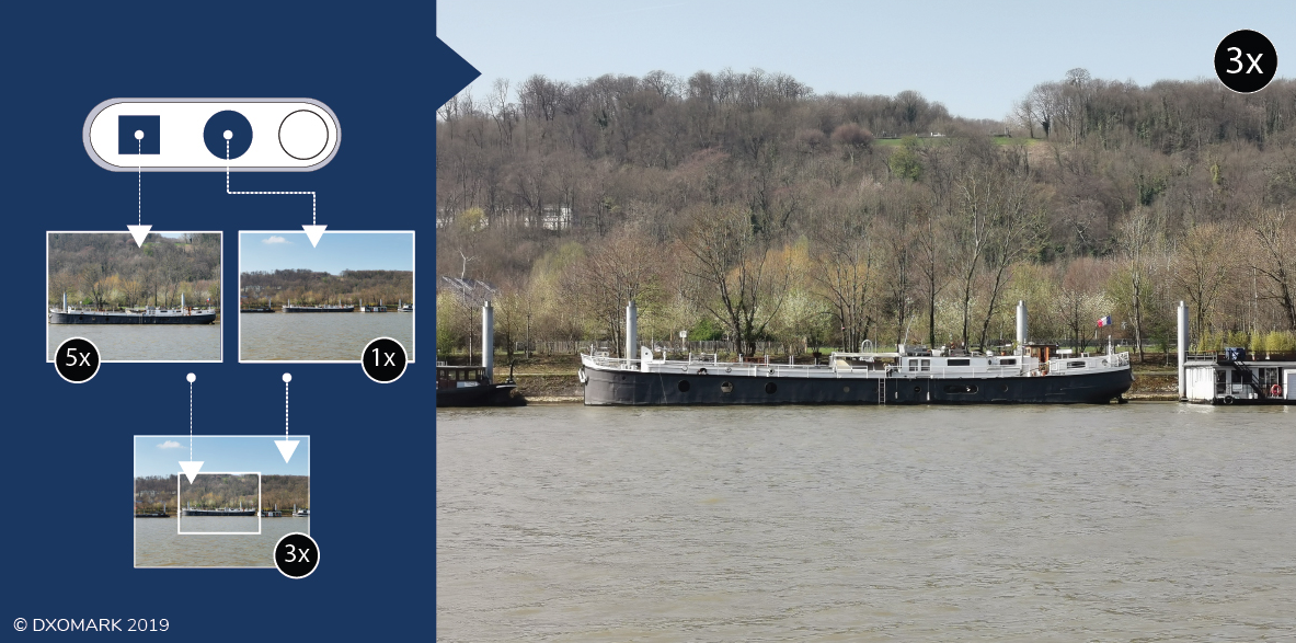 使用5倍变焦系数时,该摄像头完全仰赖远摄镜头来实现变焦,而在使用3到5倍之间的变焦拍摄时,则通过合并主摄像头和远摄摄像头的图像数据来产生图像,画面中心的最佳细节图像数据来自5倍远摄镜头,而其边缘“丢失”的图像区域则由主摄像头的图像数据来填补,然后利用人工智能予以润饰,这是一种深度学习算法,可以改进精细图案和纹理的细节。