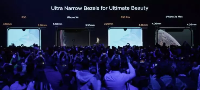 华为现场将P30系列手机的边框数据直接列了出来,并且直接和iPhone XR、iPhone XS Max对比,这种几毫米的差别很可能大多数消费者即便上手都不会发现,但的确可以在一定程度证明华为的工程能力。