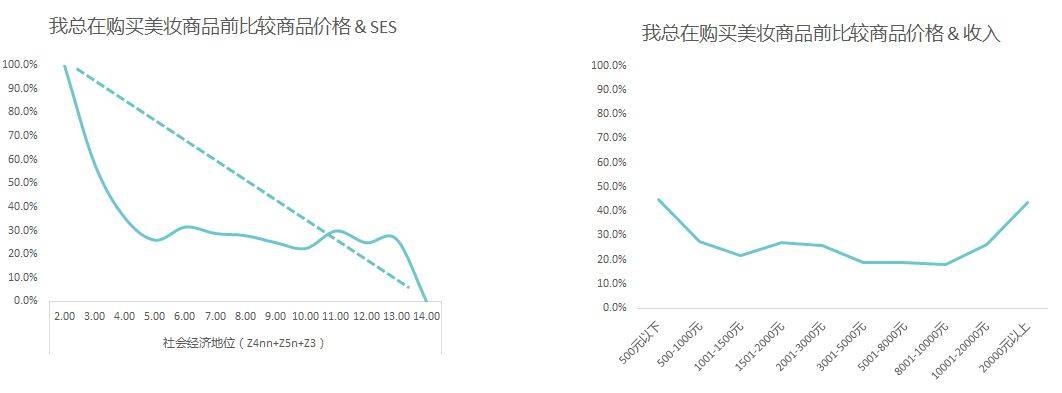 例证2:CDC美妆调研中,以美妆购买前是否比价为因变量,对比社会经济地位(SES)和收入。结果发现,颜值当道的时代,人们普遍愿意为美妆投入。较低社会经济地位的用户更常比较产品价格,而中等及以上社会经济地位的用户对产品比较的动力均不足;较高社会经济地位的用户几乎不进行购买前的比价。同样,收入在这件事上没有显著的趋势。