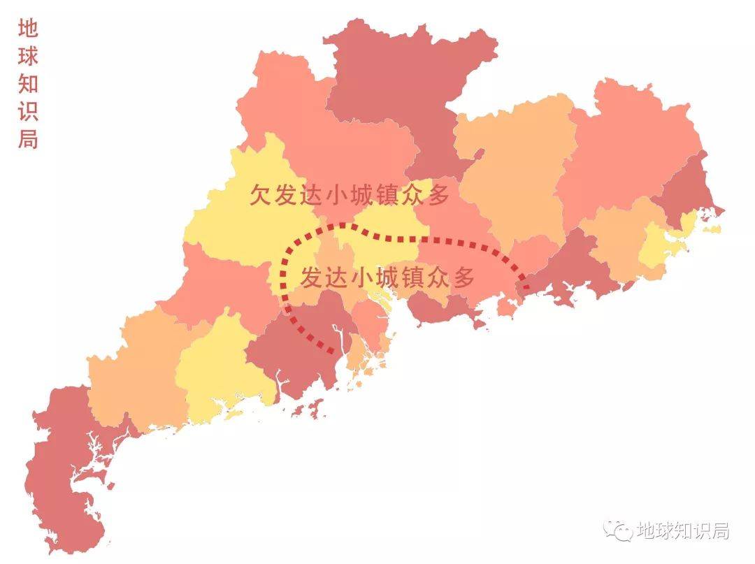在粤东、西、北三个地区共有796个小城镇,多达647个为欠发达城镇,占到80%。反观珠三角地区纳入统计的小镇共有321个,其中139个为欠发达城镇,一半不到。即使是这些珠三角的欠发达小镇,也大多分布在肇庆西部、清远北部、惠州东部,仍然属于广义上的粤东、粤北、粤西山区。