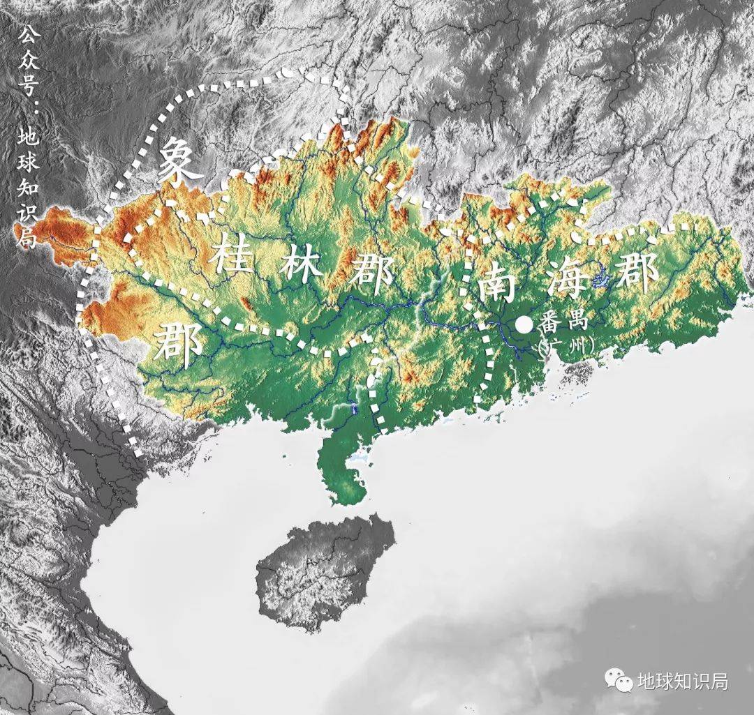 秦在岭南建立的三个郡:南海、桂林、象,番禺(广州)是一个重要的中心