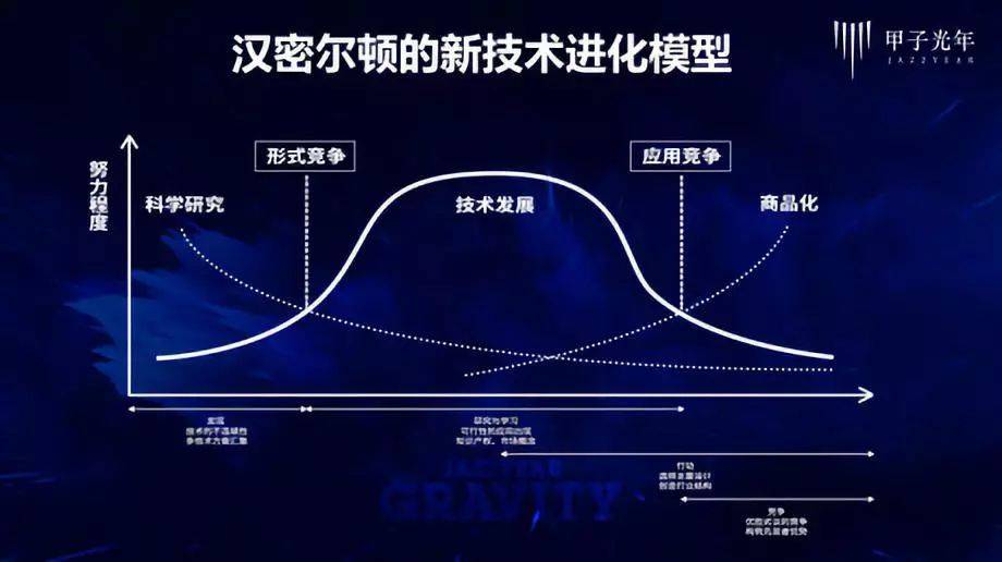 回顾一级市场AI公司估值逻辑的演变,从最初的f(算法,人才),到f(算法,人才,市梦率↑,行业地位↑),再到f(算法↓,人才↓,市场空间↑,数据↑,行业地位↑),AI估值逻辑的演变路径和20世纪90年代末沃顿商学院的威廉·F·汉密尔顿教授基于技术物种进化思想提出的“新兴技术发展演化模型”的内在演变逻辑一致: