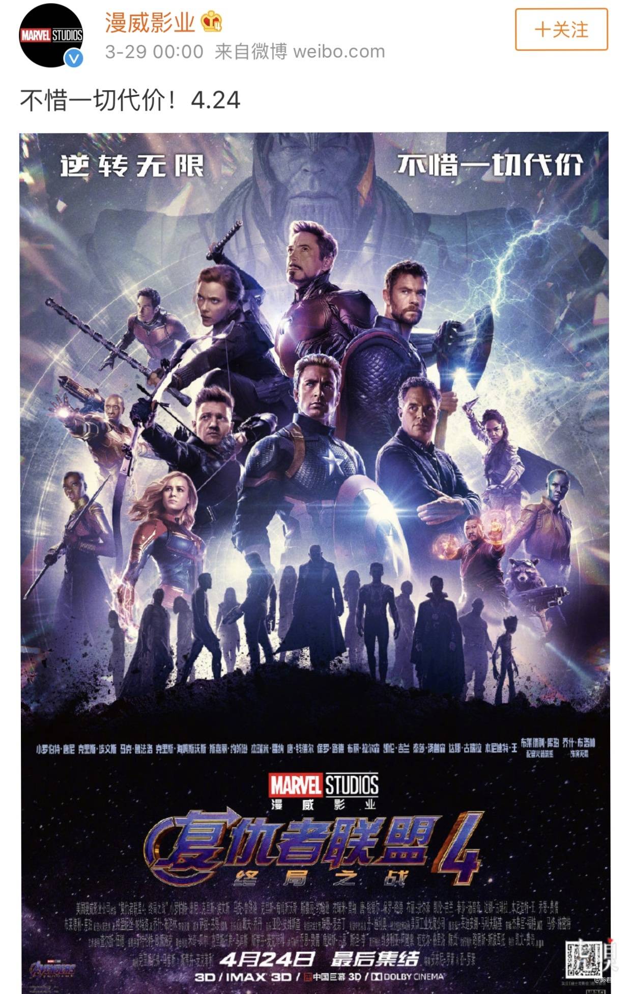 @虎嗅 《复联4》官宣定档4.24,关键是,这比其在北美上映还早了两天......