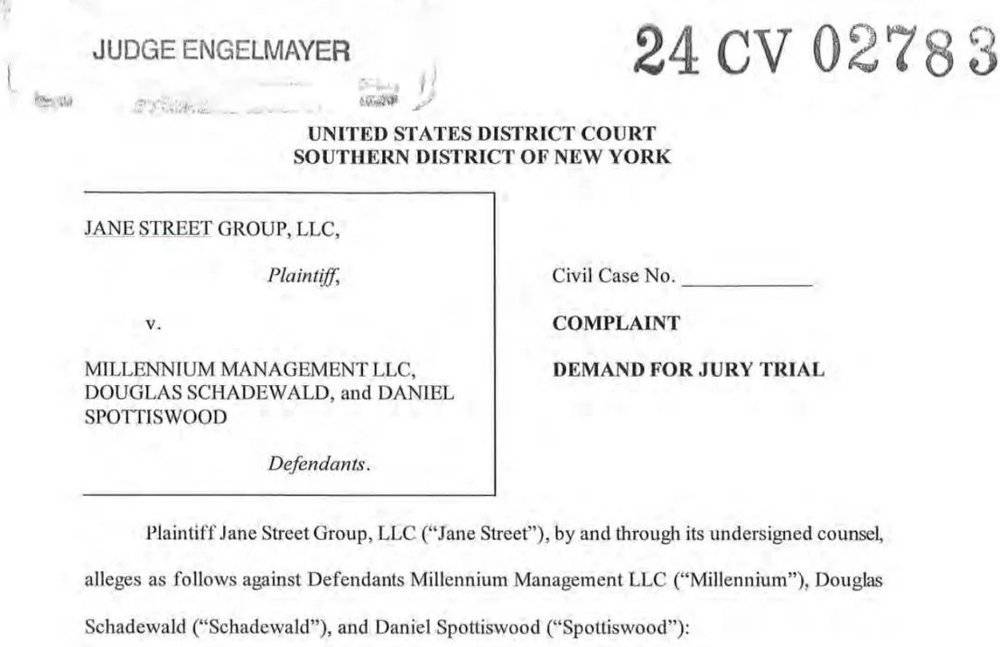 根据纽约曼哈顿法院的文件,眼下同为全球顶流的量化交易大厂简街资本(Jane Street Group)正在与千禧年(Millennium Management)资管对簿公堂,指控其与两名前员工偷窃高度机密且“极具价值”的交易策略。