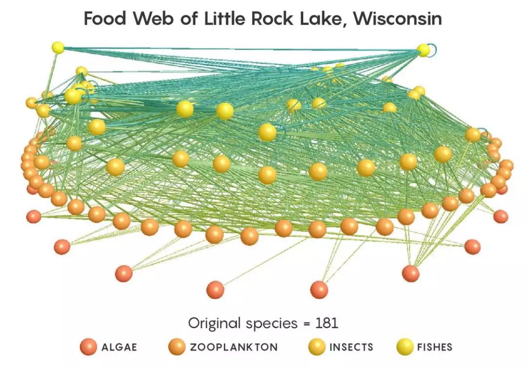 Dunne 是圣塔菲研究所科学副主席,她从植物生态学开始,进而研究食物网。通过对生态系统中的每一个物种及所需的食物进行精心分类,Dunne 和同事构建了一个可以量化的食物网。在可视化的数据中,每一个置身于食物网中的物种都被表示成了一个节点;用节点之间的连边表示两个物种之间的捕食与被捕食关系。
