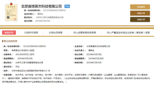 工商信息显示,北京赛博英杰科技有限公司成立于3月29日,谭晓生为法定代表人,注册资本为100万元,公司经营范围为技术开发、技术咨询、技术转让、技术推广、技术服务;软件开发;应用软件服务;计算机系统服务;企业管理;企业管理咨询;教育咨询(中介服务除外);基础软件服务;销售自行开发后的产品;软件咨询;产品设计。