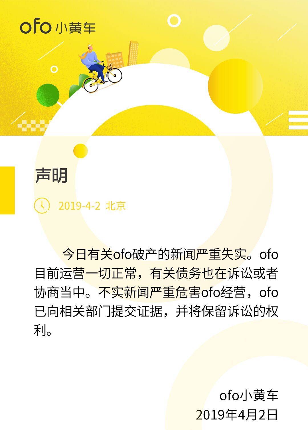 对此,ofo回应:消息严重不实,目前运营一切正常。
