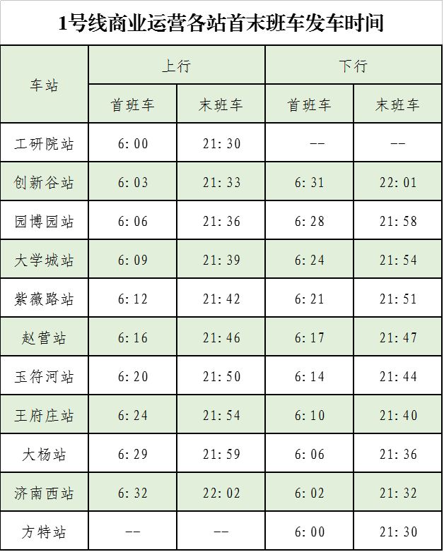 据济南轨道交通集团有限公司发布的消息,济南地铁1号线于2019年4月1日商业运营,首班车于早6:00在工研院站和方特站同步对向始发。