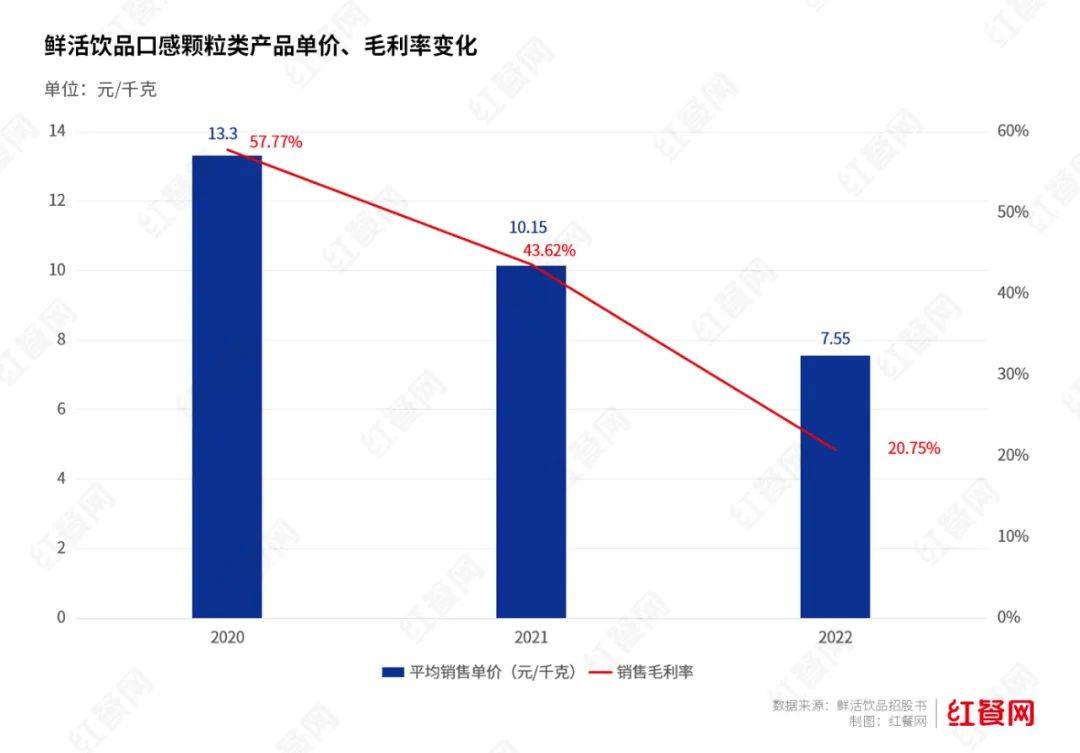 2020~2022年,平均销售单价分别为13.3元/KG、10.15元/KG和7.55元/KG,销售毛利率分别为57.77%、43.62%和20.75%。而这项业务对鲜活饮品营收的贡献率近3成。