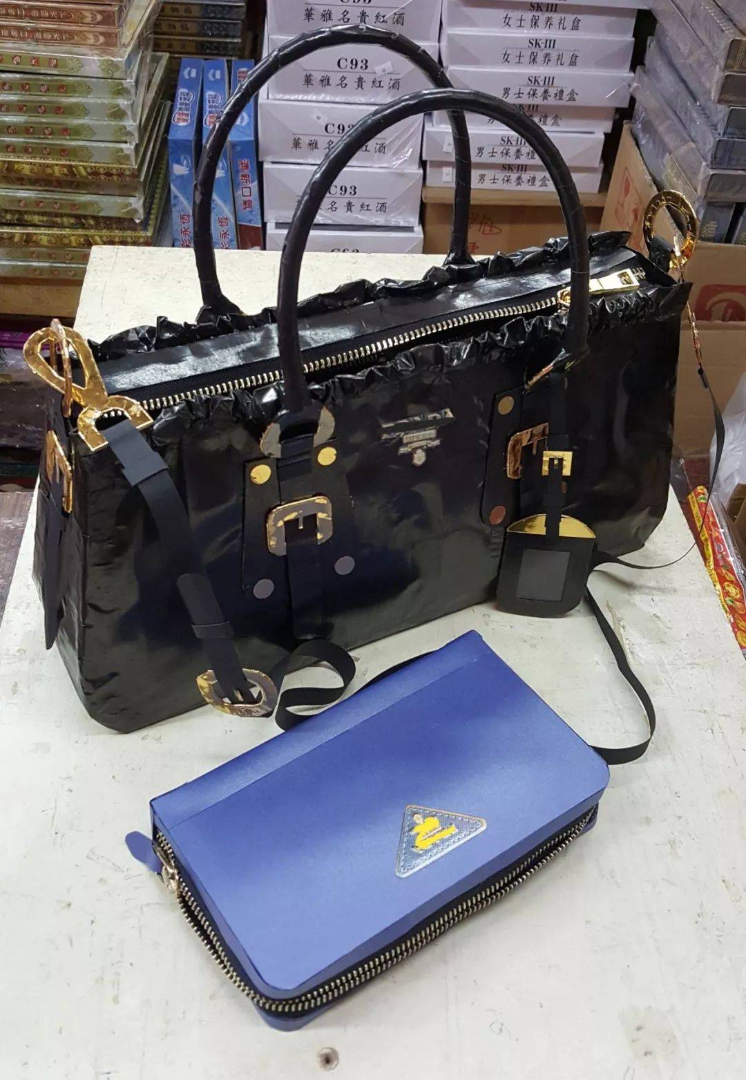 通常我们做纸扎手袋或者衣服,拉链是用金色的纸模仿出来,不会使用真的拉链。面对来退货的客人,我只好用刀把“包包”割开,将一条真的拉链黏上去,这样就可以拉开了。