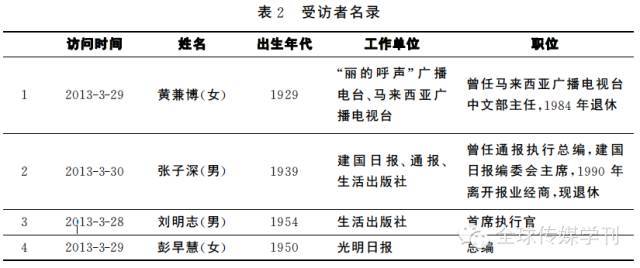 (1)访问:依次访问四位华文媒体工作者并用录音设备记录。让受访者签署“参与口述访谈同意书”。