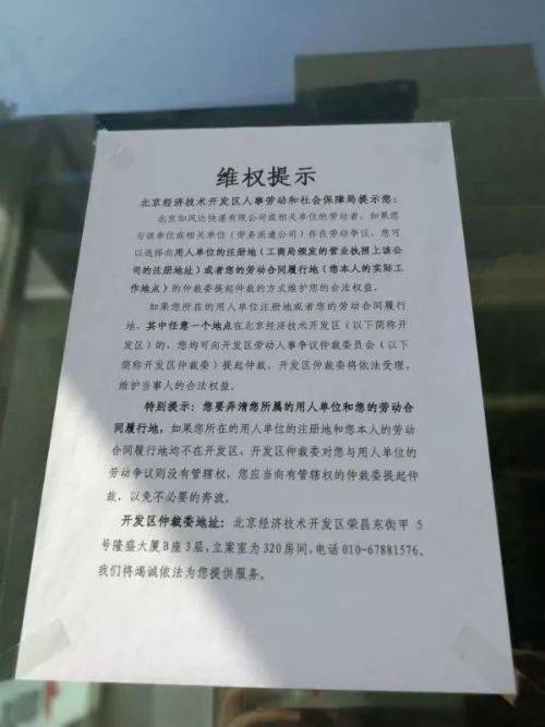 如风达门口贴的维权提示(任晓宁 摄)