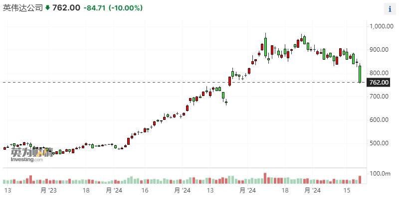 周五(4月19日),英伟达下跌10%,创下2020年3月以来的最大日跌幅,总市值一日蒸发了超2000亿美元(约合14480亿人民币),股价收于每股762美元,为2月22日以来的最低水平,也是去年11月以来首次收于50日移动均线下方。