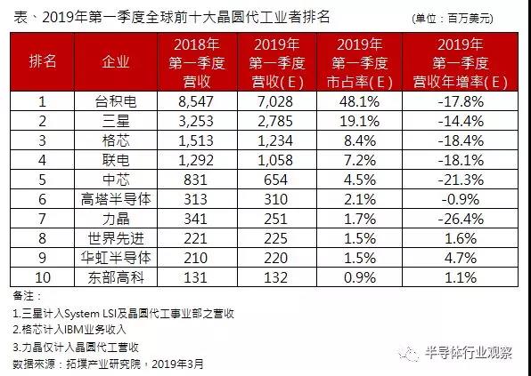 上周,拓墣产业研究院公布了全球晶圆代工厂商在2019年第一季度的排名,重点介绍了前10位的营收情况。
