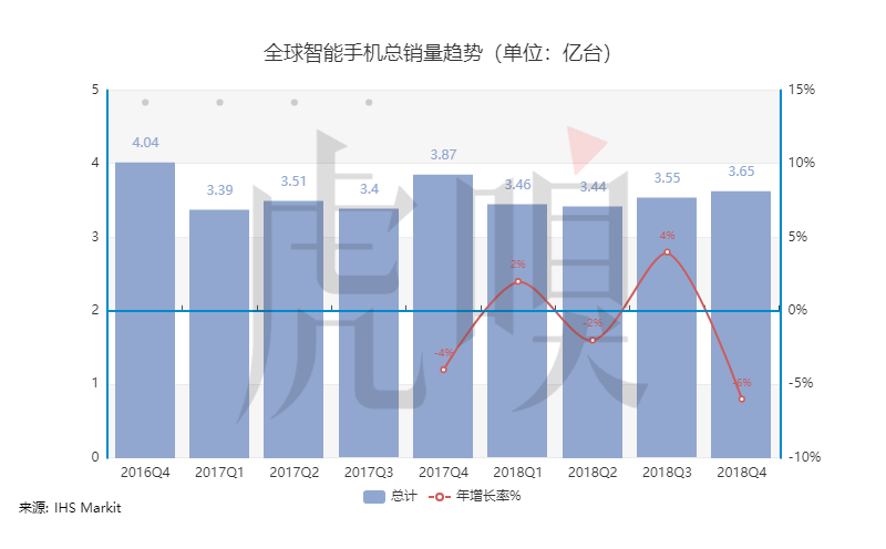 根据行业内咨询机构IHS Markit的统计数据,2018年全球智能手机的销售量里面,只有Q1、Q3同比增幅为正数,Q2、Q4均为负数,Q4实际下滑比率达到了6%。