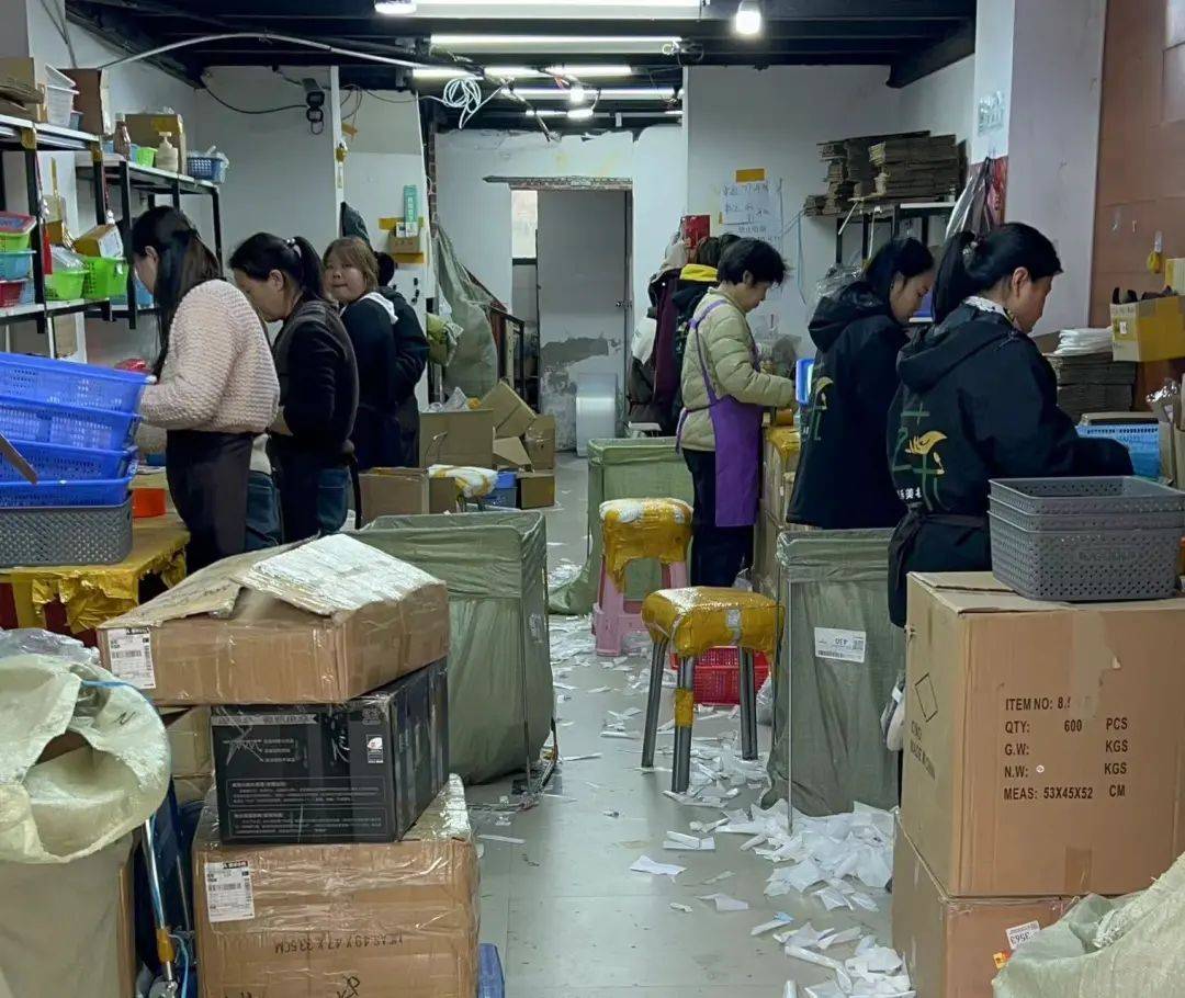 △在东海县打包穿戴甲的批发商们。(图源:时代周报记者 王晨婷/摄)