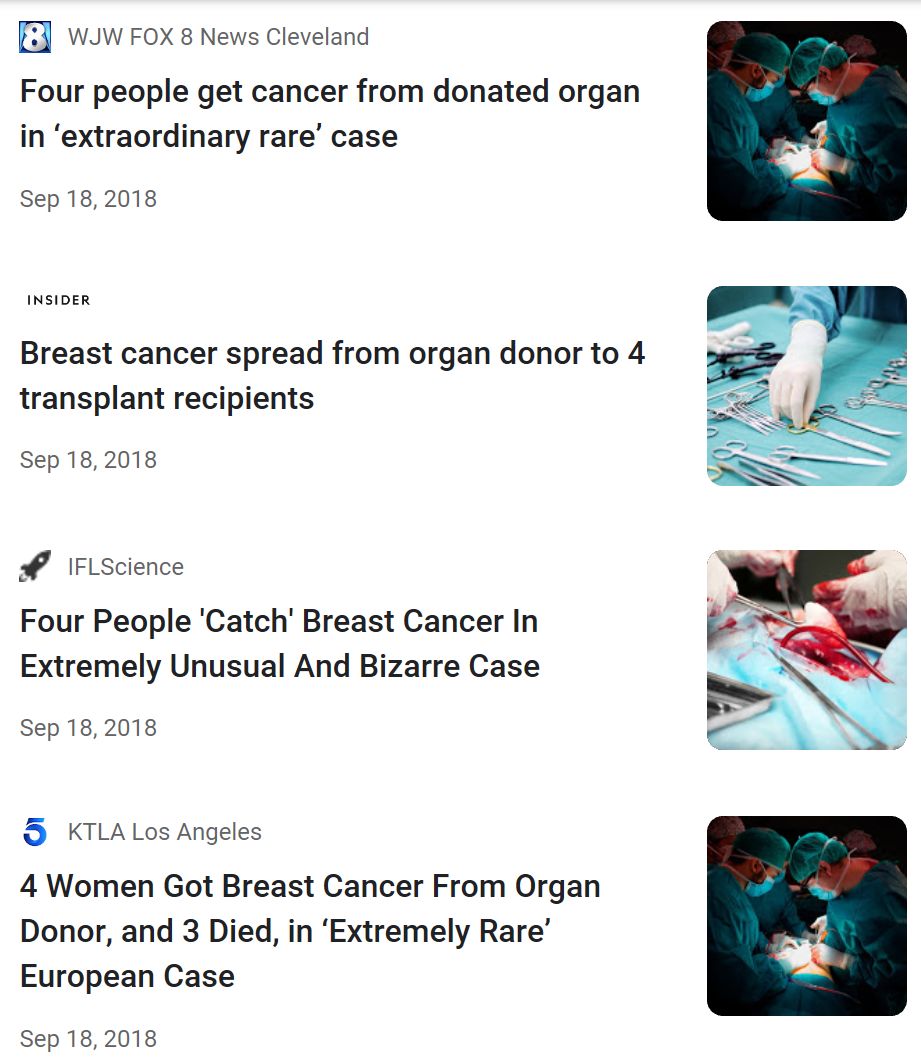 去年,American Journal of Transplantation 杂志报道了一个恶性肿瘤转移扩散的罕见病例[1],随后又被多家新闻媒体转载报道过(图1来自网络)。