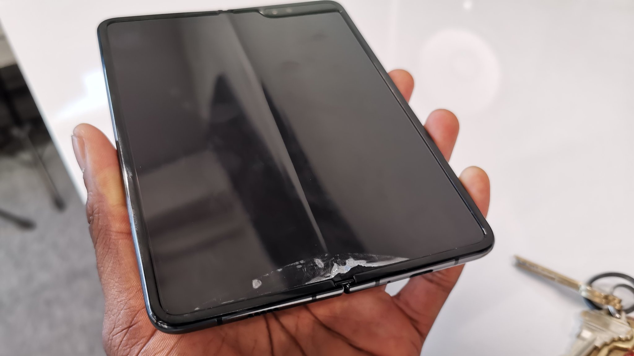 彭博社的 Mark Gurman 发推表示,自己收到的 Galaxy Fold 在经过一天的使用后,点击屏幕会出现一条裂痕,随后整个屏幕完全故障: