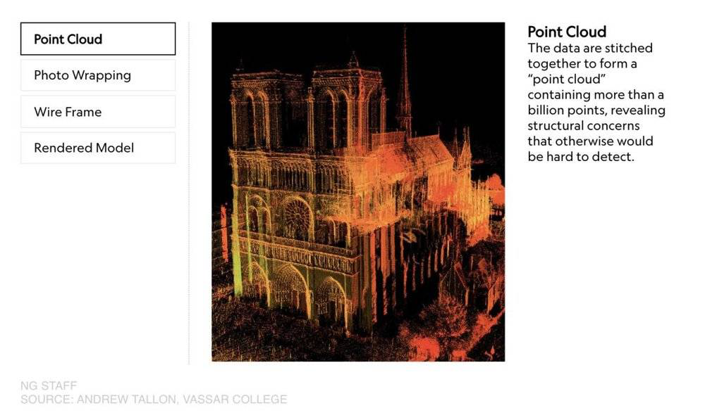 最后,采集的数据被拼接成一个包含10亿个点的“point cloud(点云) ”,打造出逼真的三维立体模型。这些数据将直接辅助完成教堂的修复工作,还原出受灾前的原貌。