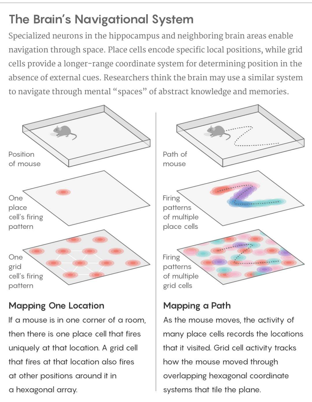 正如哲学家康德所说,空间概念是我们藉以感知与解释世界的组织性原则,其中不乏抽象的方式。人工智能公司DeepMind的神经科学家金·斯塔肯菲尔德(Kim Stachenfeld)说:“我们的语言充满了用以推理和记忆的空间隐喻。”过去十几年的研究表明,那些隐喻——至少在记忆与导航两种能力方面——可能在大脑中具有物质基础。