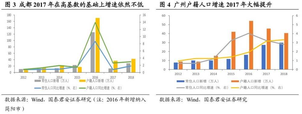 对于农业转移人口落户政策2019年最大的突破点在于大城市的放开以及超大特大城市的规模增加。今年的建设任务中,对于人口落户政策的放开从前期的中小城市转向了大城市,并对超大特大城市也提出了“精简积分项目、大幅增加落户规模”的目标,而在2018年任务中的超大特大城市还处于以“制定差别化落户条件”为目标的落户要求。根据2014年国务院发布的《关于调整城市规模划分标准的通知》,城区常住人口在100万-300万的为II型大城市,300万-500万的为I型大城市,500万-1000万的为特大城市,1000万以上则为超大城市。按《中国城乡建设统计年鉴2017》中的统计,超大城市只有北京、上海、深圳、重庆,23个省会城市中有4个在特大城市,8个在I型大城市,余下除拉萨以外都属于II型大城市。2017年曾出现杭州、成都、长沙、南京、西安等多个城市因放宽落户政策而出现的“抢人才大战”,明显带动当年户籍或常住人口同比大幅提升。由此可见,落户政策放开将对实际落户效果产生显著正效应。