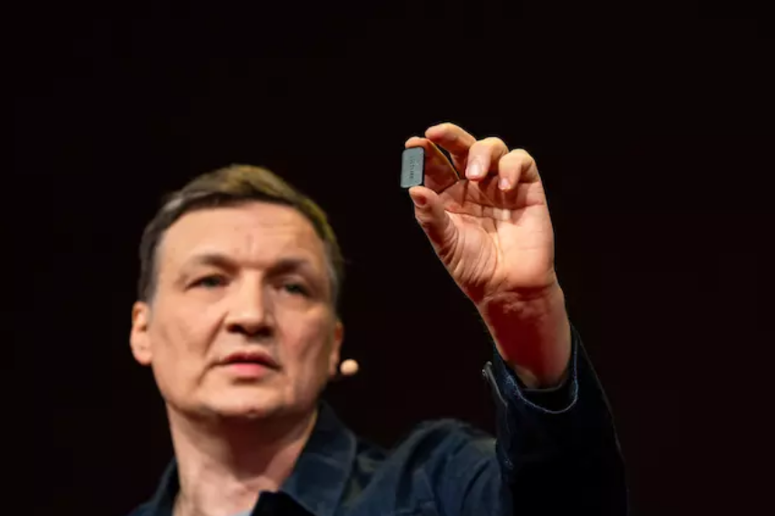 他将一块谷歌的Jacquard芯片放进了夹克衫的袖口内,通过操纵左手袖口上向外滑动就完成切换下一张PPT。