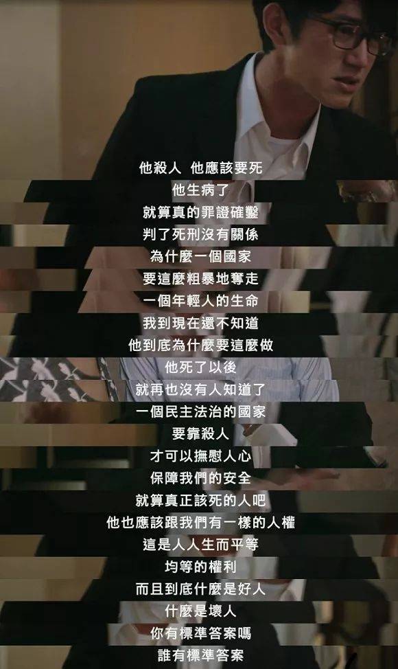 剧中这位律师不禁让人想起另一位新闻主角——小灯泡的妈妈。2016年,她在台北街头目睹自己3岁的女儿小灯泡被割喉身亡。作为无差别杀人案中年龄最小的受害者的母亲,她却说,“我不是反对死刑,而是反对大众除之而后快的心态。”一位尚未从悲痛中走出、或许永远无法走出悲痛的母亲讲出这番话,不免令人震惊与深思,她有着怎样不可动摇的理性和包容?又是如何做到放下当前的仇恨,放眼更远大的社会信念问题的?