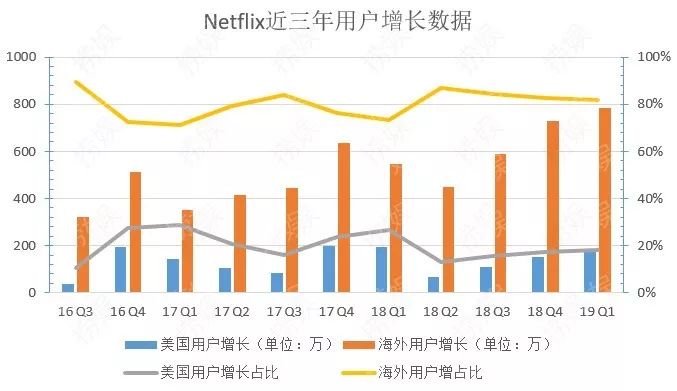 统计Netflix近三年的用户增长数据可以发现,不论是美国还是海外,Netflix的用户增长都呈现出周期性,即“年初年终增幅高、年中增幅低”。海外用户与美国用户要么一起快速增长,要么一起增长放缓,并没有出现普遍认为的北美用户增长乏力。