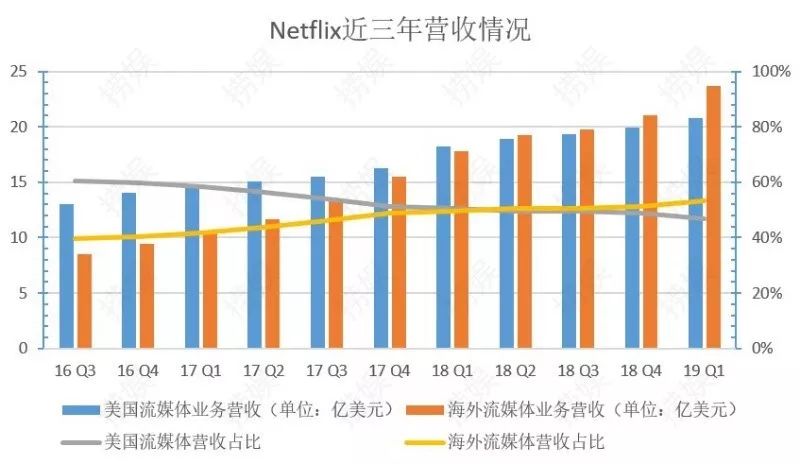 在2016到2017的两年间,Netflix美国流媒体营收虽然高于海外,但已经呈现出下降趋势,最终在2018年Q2被反超。然而根据媒体报道,Netflix早在2017年6月底(Q2),海外的用户数量就已超过美国(5230万vs 5192万)。