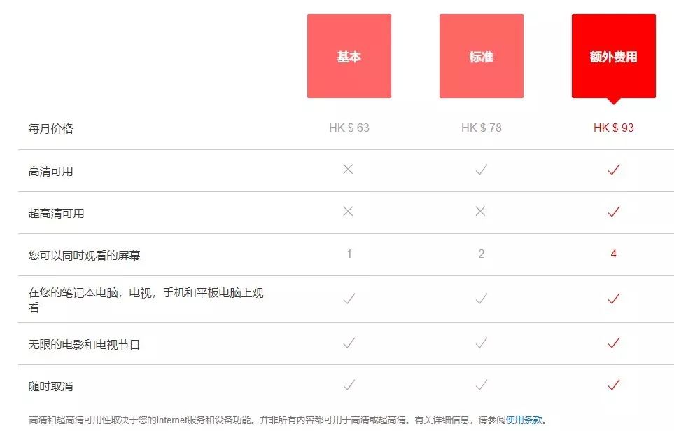 第六,Netflix提供多种订阅方式,包括基本、标准、高级。具体的差别在一个账号可授权设备的数量与片源的清晰度,本文仅以基本会员价格参考。(Netflix新注册会员首月免费)