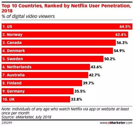 从eMarketer的“2018年Netflix全球用户渗透率排行报告”可以看出,没有一个国家/地区进入前十的亚洲,显然将会是Netflix的关注重点,而这一庞大的市场,或足以让Netflix以现有模式再高速发展10年。