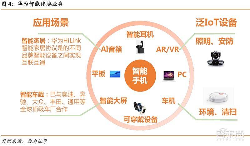 华为硬件生态圈以华为手机产品为核心,打造万物互联的“全场景智慧生活时代”,围绕多样应用场景创新智能终端设备。