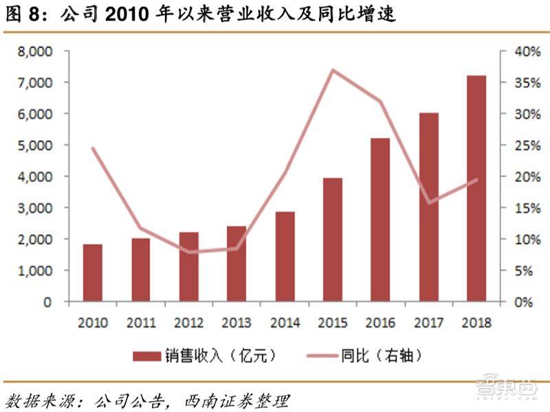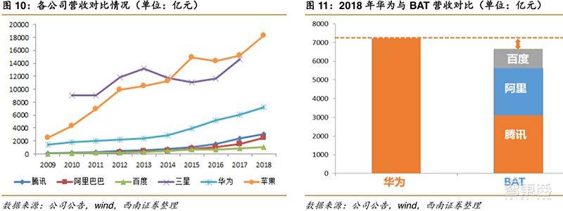从财务全景来看,从2010年以来,华为营业收入平均复合增速达到18.7%,其营收体量虽与行业巨头三星、苹果仍有一段差距,但已远远超过国内BAT三巨头。