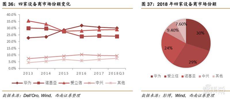 根据调研机构Dell’Oro报道,2018年华为全球市场份额达到30%,已连续四年保持全球第一的市场地位。爱立信份额为29.0%,相比2017年提高了2.4个百分点,接近华为。另外,诺基亚的市场份额稳中有升,达到24%,中兴通讯市场份额则下滑到11.7%。
