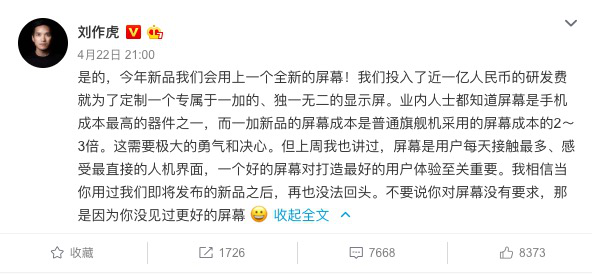 这块新屏幕究竟能有多强?刘作虎在微博上用了这样一句话来描述:“我相信当你用过我们即将发布的新品之后,再也没法回头。不要说你对屏幕没有要求,那是因为你没见过更好的屏幕。”